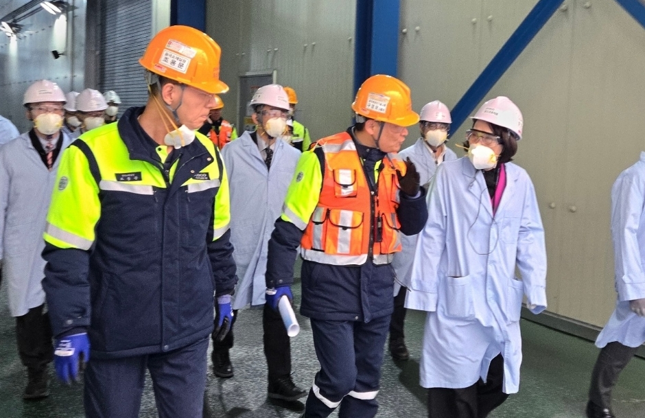 강인선 차관(사진 왼쪽)이 포스코퓨처엠 관계자로부터 이차전지 핵심소재인 음극재 제조 공정에 대한 설명을 듣고 있다.