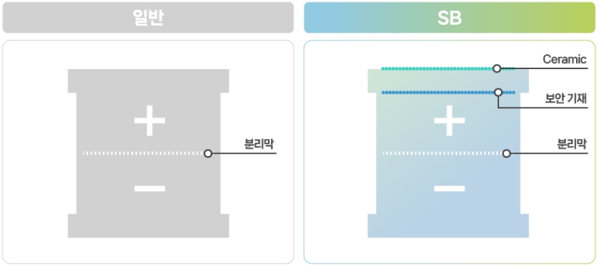 또한, 배터리 안전성을 개선한 SB(Safety Battery) 기종을 개발하고 있다. 일반 배터리는 90 º 굽힘이나 펼침, 과도한 낙하, 못 관통과 같은 과도한 물리적 힘에 의해 손상되기 쉽다. 극판이 갈라지거나 분리막이 찢어지면 쇼트가 발생할 수 있기 때문이다. 하지만, SB 기종은 유연성이 높은 극판을 사용해 갈라짐을 예방하고 세라믹 절연층과 보완 기재를 활용해 쇼트 발생을 차단한다. 또한, 안전성 첨가제를 사용해 리튬 덴드라이트*를 억제한다.