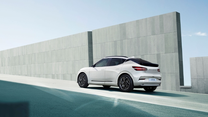 후면부의 리어 스키드 플레이트는 차체 색상과 동일한 디자인으로 깔끔하게 구현돼 모던하고 견고한 SUV 느낌을 부여하는 동시에 GV60의 넓고 낮은 스탠스를 강조한다.
