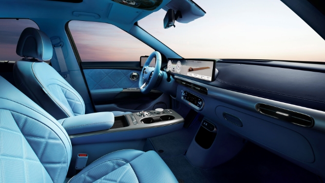 제네시스는 GV60에 클러스터와 AVN 화면 사이의 베젤을 없앤 27인치 통합형 와이드 디스플레이를 적용해 고급스럽고 하이테크한 분위기를 조성했다.