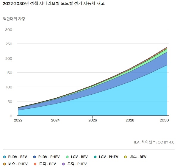 전기 자동차의 총 차량대(2륜/3륜차 제외)는 2022년 약 3,000만 대에서 2030년 약 2억 4,000만 대로 증가하여 약 30%의 연평균 성장률을 달성할 것으로 예측되는 정책 시나리오(STEPS)에서 나타났습니다. 이 시나리오에서 전기 자동차는 2030년까지 도로 차량 차량대의 10% 이상을 차지할 것입니다. 전기 자동차의 총 판매량은 2025년에 2,000만 대를 넘고 2030년에는 4,000만 대를 넘을 것으로 예상되며, 각각 전체 차량 판매량의 20%와 30%를 차지할 것입니다.