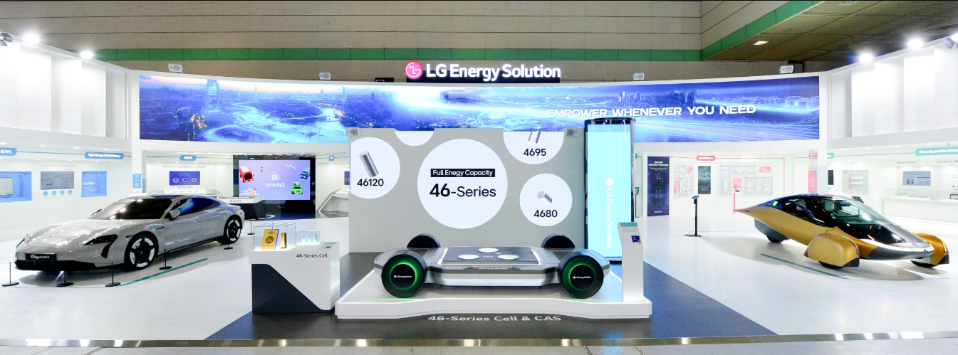 LG에너지솔루션 부스 중앙에 위치한 Hero 배터리 솔루션 존에서는 ‘인터배터리 어워즈’ 수상작 ‘원통형 46시리즈 배터리와 CAS(Cell Array Structure)’기술이 눈길을 끌었다.