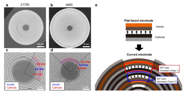 원통형 리튬이온배터리의 X-ray CT 이미지 및 전극 반응 인터페이스 비교. 21700형 (a, c) 및 4680형 (b, d) 원통형 리튬이온배터리(LIB)의 X-ray CT 이미지. (e) 평면 전극과 곡면 전극의 반응 인터페이스를 비교한 개략도. 곡면 전극에서는 기준 전극이 마주 보는 면이 오목하거나 볼록하느냐에 따라 음극과 양극 간의 용량비(N/P Ratio)가 달라진다. 상단부 검은색 양극을 기준으로 했을 때(빨간 박스)는 마주보는 면이 오목하며 N/P Ratio가 커지고, 아래쪽은 검은색 양극을 기준으로 했을 때(파란색 박스) 마주보는 면이 볼록하며 N/P Ratio가 줄어든다.