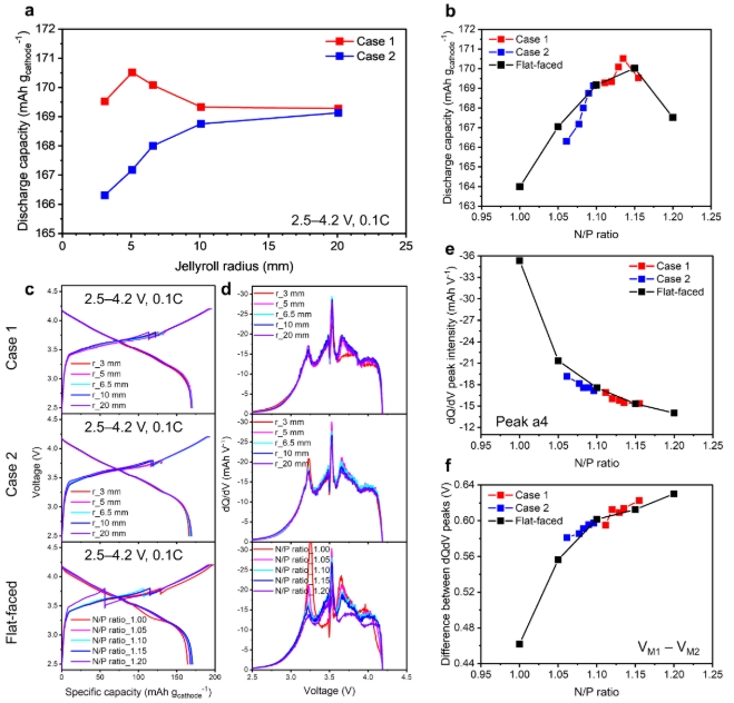 전극 곡률이 배터리 전기화학 성능에 미치는 영향 분석. (a) 젤리롤 반경에 따른 풀셀의 0.1C 방전 용량. (b) N/P 비율에 따른 풀셀의 0.1C 방전 용량. (c) Case 1, Case 2, 및 평면 전극 셀의 전압 프로파일. (d) Case 1, Case 2, 및 평면 전극 셀의 방전 dQ/dV 곡선. (e) 음극 피크 4 (a4)의 강도 변화. (f) dQ/dV 곡선에서 국소 최소 피크 1 (M1)과 피크 2 (M2) 사이의 전압 차이를 N/P 비율에 대해 나타낸 그래프.