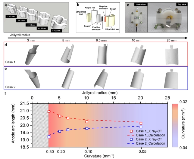 맞춤형 곡률 적용 장치 및 전극 곡률과 접촉 호(arc) 길이 (a) 맞춤 제작된 곡률 적용 장치의 설계 및 구성 요소. (b) 해당 장치를 사용하여 제작된 파우치형 풀셀의 구조. (c) 조립된 파우치 셀의 사진. (d) 젤리롤 반경에 따른 전극 재구성 이미지 (Case 1). (e) 젤리롤 반경에 따른 전극 재구성 이미지 (Case 2). (f) X-ray CT 및 계산을 통해 분석한 전극 곡률 기반 음극의 호 길이.