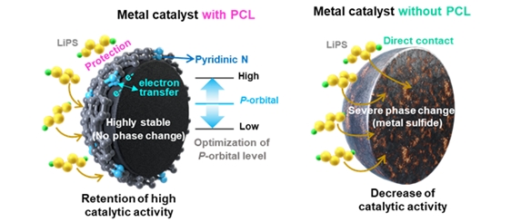 이진우 교수 연구팀은 이번 연구를 통해 리튬황전지 양극에 추가되어 황의 전기화학적 반응성을 개선해줄 수 있는 금속 나노입자의 표면에 얇은 기능성 탄소 보호층을 도입함으로써, 양극에서 발생하는 황의 전기화학 전환 반응의 반응성과 수명 안정성을 대폭 향상시키는데 성공하였다. 이 탄소 보호층은 반응 생성물인 리튬 폴리설파이드와 금속 나노입자 간의 직접적인 접촉을 차단해 기존에 발생했던 부반응 및 상변화를 예방하여 수명을 크게 향상시킬 수 있다. 또한, 해당 탄소 보호층은 전자 전달에 도움이 되는 질소 원자가 첨가되어 있어, 금속 나노입자와의 전자교환이 원활히 이루어진다. 금속 입자의 종류를 제어함으로써, 탄소 보호층 내의 질소 원자의 최적화된 전자구조를 유도함으로써, 양극 반응성 또한 크게 향상시킬 수 있다.