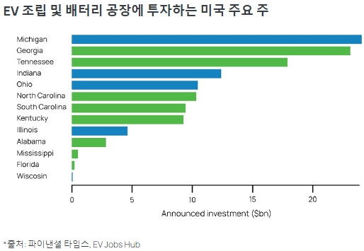 미국 남동부 지역은 전기차 및 배터리 제조 투자에서 다른 지역보다 앞서 있습니다. 지난 수십 년 동안 건설된 최첨단 시설을 전기차 공장으로 전환하는 데 박차를 가하고 있습니다. 배터리 벨트의 핵심 지역인 남동부 지역은 전기차 조립 및 배터리 공장에 투자하는 상위 8개 주 중 5개 주(조지아, 테네시, 노스캐롤라이나, 사우스캐롤라이나, 켄터키)를 차지합니다.