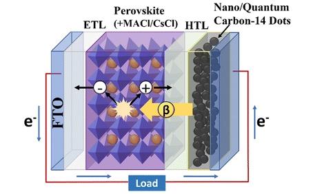 대구경북과학기술원(DGIST) 에너지공학과 인수일 교수 연구진은 방사성 동위원소인 C-14(탄소-14) 기반 양자점을 전극에 삽입하고, 페로브스카이트 흡수층의 결정성을 향상시키는 공정을 수행함으로써 전력 출력의 안정성과 에너지 변환 효율을 동시에 확보하는데 성공했다.
