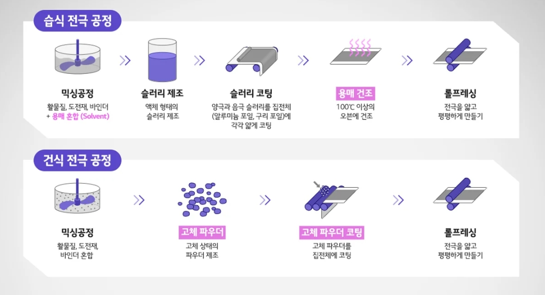 기존의 습식 전극 공정은 원재료들을 용매에 분산/용해시켜 집전체에 도포한 후 이를 건조해 전극을 만드는 방식이었습니다. 건식 전극 공정은 이와 반대로 용매를 사용하지 않고 활물질, 도전재, 바인더를 고체 상태로 믹싱한 파우더를 집전체에 코팅하는 과정을 거칩니다. 이처럼 공정을 간소화함으로써 생산 효율성이 더욱 높아집니다.