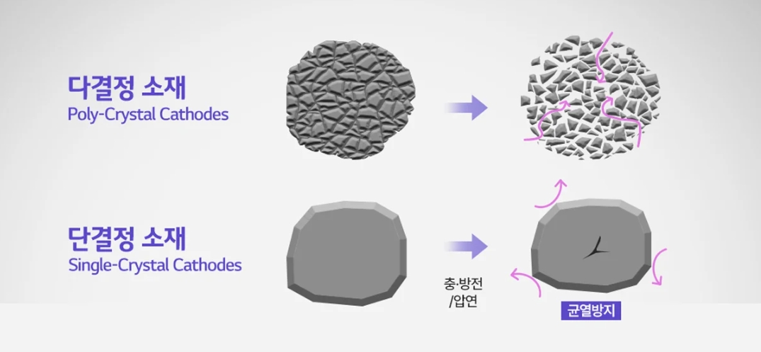 대표적으로 ‘단입자(Single-crystal, SC)’ 양극재 소재 연구를 들 수 있습니다. 기존에 사용되던 다결정(Poly-crystal, PC) 구조는 여러 입자가 결합된 형태로, 충·방전 및 압연 과정에서 입자 간 균열이 발생할 가능성이 있어 배터리 성능에 영향을 주었는데요. 단일 입자로 구성된 단입자 구조는 균열을 줄여 더 높은 안정성과 향상된 배터리 수명을 기대할 수 있습니다.