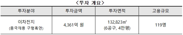 ㅇ ㈜퓨처그라프는 2027년부터 연 3만 7천 톤을 생산할 계획으로 이는 천연흑연 음극재 3만 3천 톤을 생산할 수 있는 규모이다. 총 투자액은 약 4.4천억 원으로 120여 명의 신규 인력을 채용할 예정이다.