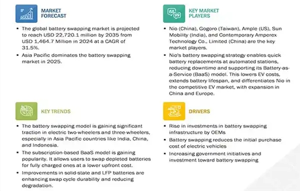 보고서는 "NIO(중국), 고고로(대만), 혼다(일본), 야마하(일본), 지리(중국)와 같은 주요 OEM이 충전 중단 시간을 줄이고 초기 비용을 낮춰 EV 도입을 확대하기 위해 배터리 교체 네트워크에 막대한 투자를 하고 있다"고 강조합니다. 이러한 투자 급증은 업계가 이 기술의 미래에 대해 강한 확신을 가지고 있음을 보여줍니다.