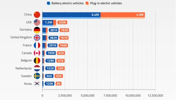 중국은 2024년 640만 대의 BEV가 판매되면서 세계 EV 시장을 여전히 장악하고 있습니다. 보고서는 이러한 성장이 "적극적인 정책, 현지 생산, 그리고 충전 인프라" 덕분이라고 지적합니다. BEV와 PHEV의 판매량을 합치면 1,130만 대에 달하며 중국 신차 판매량의 48%를 차지합니다. 이는 2023년 38%에서 크게 증가한 수치입니다.