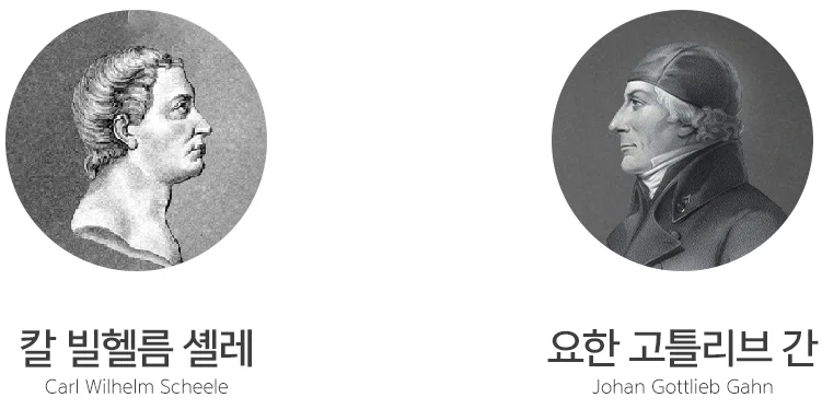 1700년대 중반에 들어서면서 많은 화학자들이 연망가니즈석에 당시까지 분리∙발견되지 않은 새로운 원소가 들어있을 것으로 짐작하였는데요. 스웨덴의 셸레(Carl Wilhelm Scheele, 1742~1786)는 1774년에 소금(NaCl)에 황산(H2SO4)을 가해 염화수소(HCl)를 얻고 이를 연망가니즈석으로 환원시켜 염소(Cl2)를 처음으로 분리∙발견하였는데, 이 과정에서 연망가니즈석에 새로운 원소가 들어있음을 알게 되었습니다. 그의 동료 간(Johan Gottlieb Gahn, 1745~1818)은 곧 바로 연망가니즈석을 숯(탄소)과 함께 가열하여 산소를 제거해 불순물이 섞인 형태로 금속 망가니즈(Mn)를 분리하였는데요. 고순도(99.9%) 망가니즈는 이보다 약 160년 뒤인 1930년대에 Mn2+ 용액을 전기분해시켜 얻게 됩니다.