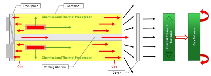 열을 주는 배터리나 셀에 기계 또는 전기화학적 이론 모듈이 단락되어, 고전류 작은, 온도를 상승시키면 현상이 발생합니다. 이 열은 빠르게 확산됩니다. "열폭주" 효과를 볼 수 있습니다. 열의 관심을 끌기 위해 셀에서 뜨거운 가스가 배출되는 벤팅(venting)이 있습니다(그림 1 참조). 주 이미지에서 볼 수 있는, 행동은 문제의 첫 번째로 작용하는 경우를 나타냅니다. 일반적으로 행위 발생 후 발생하는 불꽃(flaming)은 더 많은 문제를 일으키지 않습니다(주 이미지 참조).