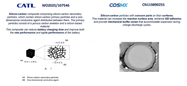 CATL과 COSMX와 같은 선도 기업들은 순수 실리콘 음극의 한계를 극복하기 위해 실리콘-탄소 복합 소재 설계에 집중하고 있습니다. CATL의 특허(WO2025/107546)는 탄소 골격에 실리콘을 내장하고 전도성 물질과 결합하여 충전 속도와 사이클 성능을 향상시키는 복합 구조를 제시합니다. 한편, COSMX는 충전-방전 사이클 동안 반응 표면적을 증가시키고 기계적 완충 영역을 제공하기 위해 오목한 표면을 가진 실리콘-탄소 입자를 개발하고 있습니다.