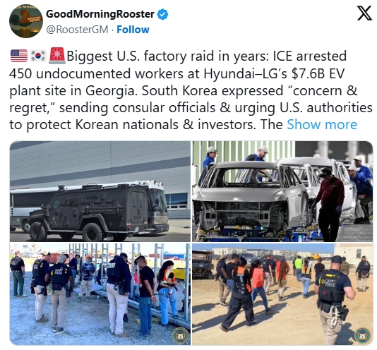 국토안보부 역사상 가장 큰 규모의 단일 이민법 집행 조치에서 미국 이민 및 관세 집행국(ICE) 요원들은 다른 연방 기관의 요원들과 조지아주 및 지방 법 집행 기관과 함께 현대자동차의 메타플랜트 EV 조립 시설을 급습 하여 475명을 체포했는데, 이들 대부분은 한국인이었습니다.