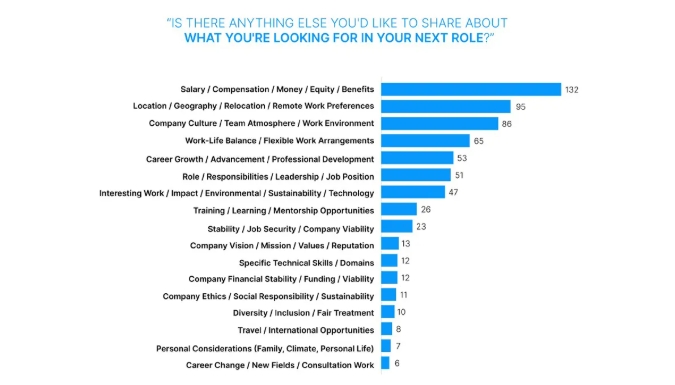 하지만 직원 유지에 관해서는 이야기가 극적으로 달라집니다. 연봉은 경력 성장 기회, 기업 문화, 근무지 유연성 등 다른 요소를 제치고 현재 직장을 떠나는 전문가들의 가장 중요한 동인이 됩니다. 이러한 "도전을 위해 왔다가 돈을 위해 떠난다"는 패턴은 중요한 문제를 보여줍니다. 배터리 산업은 혁신에 열정적인 사람들에게는 성공적으로 어필하지만, 경력이 쌓일수록 경쟁력 있는 보상을 유지하는 데 어려움을 겪고 있습니다.
