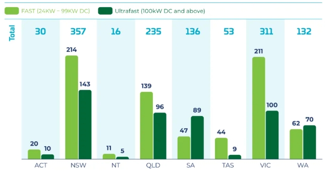 뉴사우스웨일즈주는 총 357개의 충전소를 갖추고 인프라 선두주자로서의 입지를 굳건히 하고 있으며, 이 중 214개는 24kW~99kW DC로 작동하는 고속 충전기이고, 143개는 100kW DC 이상을 제공하는 초고속 충전기입니다.