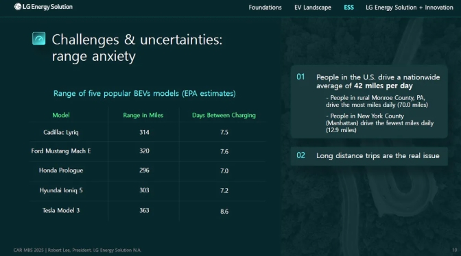충전 인프라 부족과 관련된 가장 심각한 문제 중 하나는 주행 거리, 특히 장거리 주행 시 불안감입니다. 이 대표는 LG 배터리를 탑재한 최신 전기차가 대부분의 일상 통근에 충분한 약 300마일(약 480km)의 주행 거리를 제공한다는 점을 인정하면서도, 장거리 주행은 여전히 우려 사항이라고 밝혔습니다.