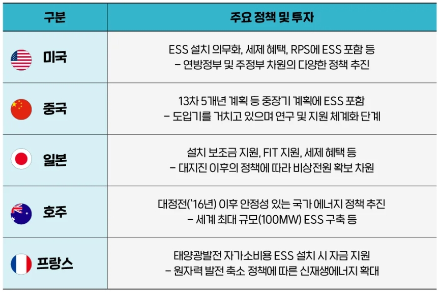 신재생 발전의 효율성 제고 측면에서도 ESS 필요성이 증대되어 각국 정부의 정책적 지원도 추가될 것입니다.