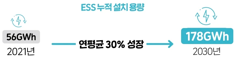 에너지 전문 시장조사업체인 블룸버그 NEF가 지난 3월 발표한 보고서에 따르면 2021년 기준 글로벌 누적 설치 용량이 56GWh로 집계됐으며, 2030년 전 세계 ESS 시장 규모는 연간 178GWh에 달할 것이라 예측하며, ESS시장이 연평균 30% 성장할 것으로 내다봤습니다.