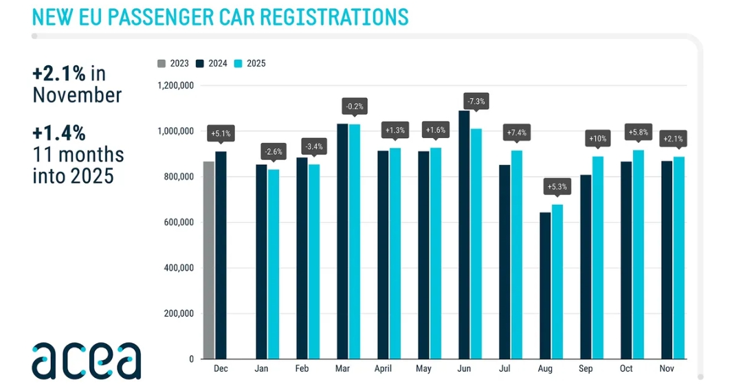 2025년 11월 전기차(BEV) 판매량은 전년 동기 대비 44.1% 증가했습니다. 하이브리드차 판매량은 4.2%, 플러그인 하이브리드차(PHEV) 판매량은 38.4% 증가했습니다.