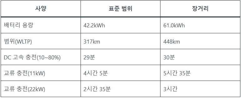 * 주행거리 및 배터리 옵션: EV2는 42.2kWh 및 61.0kWh 배터리 구성으로 제공되며, 각각 WLTP 기준 최대 317km 및 448km의 주행거리를 제공합니다.