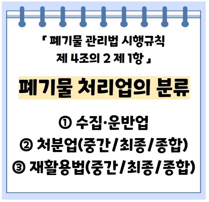 폐기물은 크게 생활폐기물과 사업장폐기물로 구분하며, 사업장폐기물이란 「대기환경보전법」, 「물환경보전법」 또는 「소음·진동관리법」에 따라 배출시설을 설치 · 운영하는 사업장이나 그 밖에 대통령령으로 정하는 사업장에서 발생하는 폐기물을 말하며 생활폐기물은 사업장폐기물 외에 폐기물을 말합니다. 보통 사업장폐기물은 아래와 같은 5가지로 구분이 됩니다.